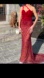 The dress in the image is a stunning, floor-length red evening gown. It features: