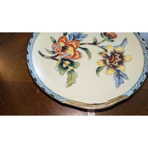 Plate with gold handles. Measures 10 inches across from handle to handle. It has a turquoise /blue rim with a black stylized design, a cream/yellow background on the inside of the plate, painted with two fully bloomed flowers, and one bud in oranges, yellows, greens and blues.