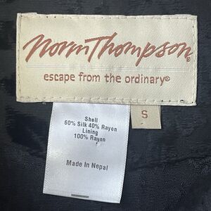 The Norm Thompson Velvet Silk Colorblock Jacket in size small features a unique patchwork design in multicolor, making it a stylish and artsy choice for various occasions such as travel, parties, casual outings, workwear, and business meetings. The jacket is crafted from a luxurious silk blend material, with a button closure and embroidered accents on the collar and buttons. The vintage-inspired piece exudes a bohemian and retro vibe, perfect for those looking to make a statement with their outerwear. Machine washable for easy care, this jacket from Norm Thompson is a versatile and chic addition to any woman's wardrobe.