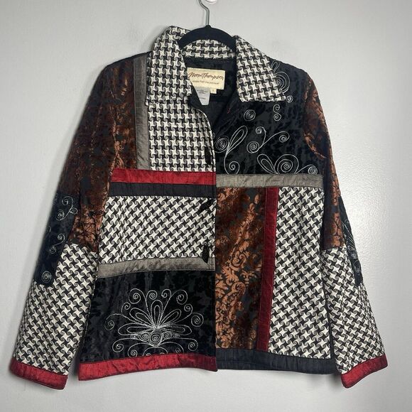The Norm Thompson Velvet Silk Colorblock Jacket in size small features a unique patchwork design in multicolor, making it a stylish and artsy choice for various occasions such as travel, parties, casual outings, workwear, and business meetings. The jacket is crafted from a luxurious silk blend material, with a button closure and embroidered accents on the collar and buttons. The vintage-inspired piece exudes a bohemian and retro vibe, perfect for those looking to make a statement with their outerwear. Machine washable for easy care, this jacket from Norm Thompson is a versatile and chic addition to any woman's wardrobe.