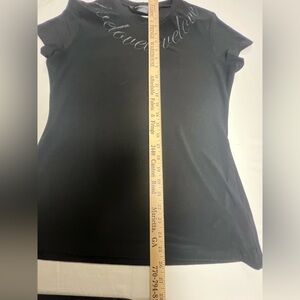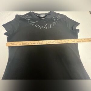 NORMA KAMALI BLACK SHORT SLEEVE SIZE XL “LOVED” GRAPHIC TOP. POLYESTER/SPANDEX