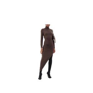 This brown ruched asymmetrical dress from Norma Kamali, size small, is designed to complement your silhouette. Made from polyester, it's perfect for any occasion.