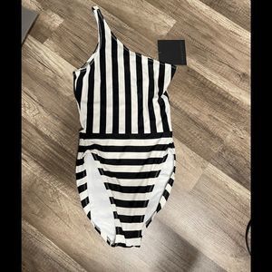 One-shoulder swimsuit featuring an optically flattering mix of vertical and horizontal stripes.