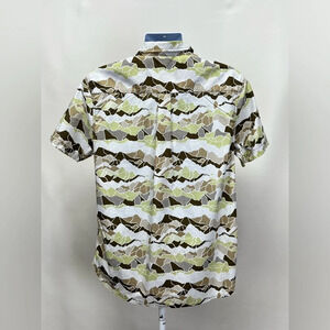 Men’s white with brown and green abstract mountain print short sleeve button down shirt from THE NORTH FACE, size L.