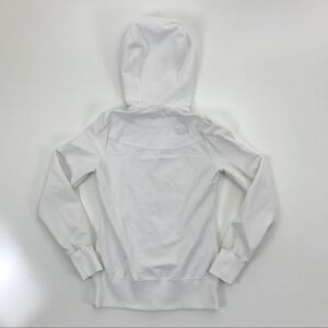 THE NORTH FACE Full Zip White Casual Button Hooded Jacket XS This beautiful jacket by The North Face is in great preowned condition - the only known flaw is a spot on the back of the right arm (see last photo). It's not noticeable and may come out with stain remover. Overall, this jacket is still in amazing condition. Unlined, but a thick material. Ribbed cuffs and bottom hem. Hood with drawstring. Pockets on front. Logo on hood, pocket, and back shoulder. Pit to Pit: 16.5" Length: 25" A13