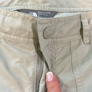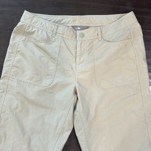 The NORTH FACE Women Capri Size 12. Has tie inside waist and inside stow pocket. EUC. The waist is 18 inches across laid flat and the inseam is 22 inches.