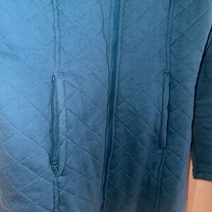 Super soft, worn twice, zipper pockets, and buttons! Color is more teal than blue!