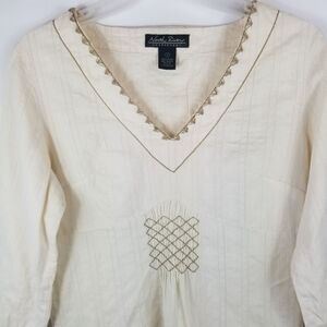 Nice 100% cotton ivory blouse with embroidery accents. Size S. Approximate measurements are pit to pit 19". Length is approximately 28". Sleeves are approximately 17". Good condition.