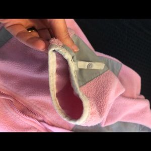 Pink and gray northface jacket. Zipper is off and shows wear on the cuffs.