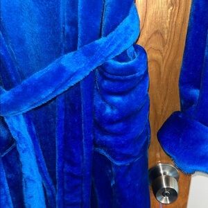 Luxurious blue plush bathrobe with belt tie. Perfect for comfort and relaxation.