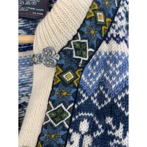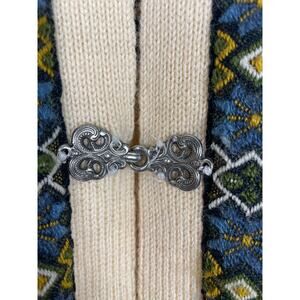 This is a beautiful vintage NORWOOL of Norway sweater made from 100% pure wool. The sweater features stunning embroidery in shades of blue, green, and cream and silver tone clasp buttons.