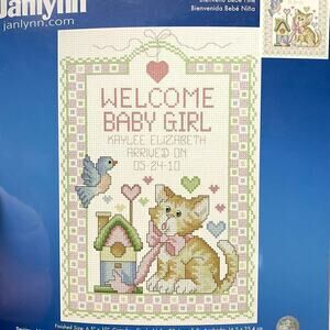 NOS 2010 Janlynn Welcome Baby Girl Kitty Sealed Cross Stitch Kit - 6.5” x10”