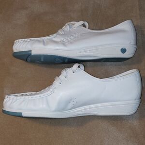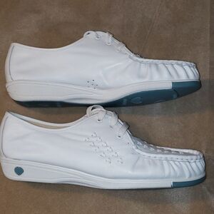 These are white leather Nurse Mates professional nurse shoes. They're kind of a desert boot or moccasin style. They have some lacing through the front and outside. They're made in USA.