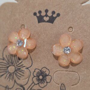 Beautiful pale peach five petal earrings with glitter throughout the petals and a white round stone in the center.