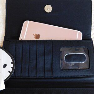 Darling Hello Kitty patch graphic sports a black and white sailor stripe T shirt and her iconic red bow. A scatter of red bows cascades the length of the wallet.