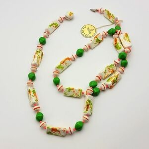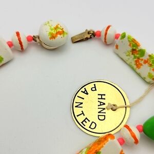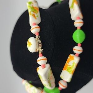 Here we have a vintage, new old stock, made in Hong Kong, super vivid, hand painted, 29" Lucite necklace with a sturdy round box clasp in gold tone metal. This is definitely a bright and bold attention getter.