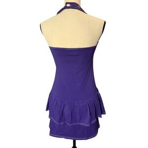 Designed with a bold purple and white color scheme and adjustable halter, this ruffled mini dress is perfect for game days or any other occasion.