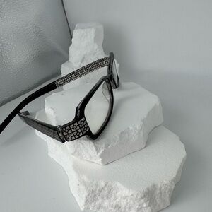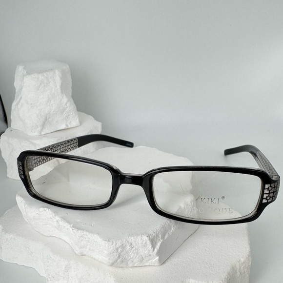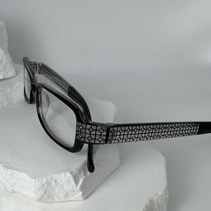 New old stock plastic eyeglasses in black with clear geometric design on temples. Super cool rectangular narrow look.