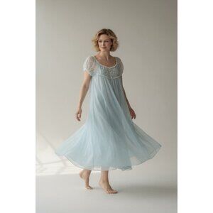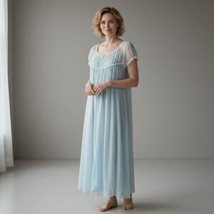 Step back into timeless elegance with this dreamy vintage Vassarette nightgown, still new with its original tags attached. Crafted in the USA, this piece features soft, flowing blue nylon chiffon with a sheer floral lace yoke and flutter sleeves that add a romantic, feminine touch. The long, sweeping silhouette is flattering and ethereal — perfect for collectors, photoshoots, bridal trousseau, or anyone who loves vintage glamour.