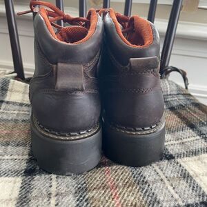 Early 90s American Eagle brown leather boots with lug sole and orange laces and trim. Size 9. I don’t think these have ever been worn. There is no wear to the soles. There is a dent on the top of one toe from storage. Fun fact: my local mall when I was growing up is the location of the very first American Eagle store opened in the late 70s and was a camping/outdoor store. When it switched to trendier youthful styles they carried higher end/quality items (Dr Marten for example). These boots are of nice quality and substantial weight. I have bended and twisted, looking for dry rot, and they are solid.