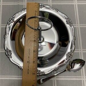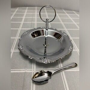 NOS Vintage Chrome Serving Dish Detachable Handle Serving Spoon Original Box Floral Accents Candy Nuts Mints Cookies Party Holiday Gathering Graduation