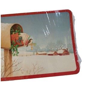 Vintage Hallmark Christmas postcards featuring a lovely snowy rural scene with a mailbox full of gifts and a little bird. The back says "Seasons Greetings" and has a place for your message.