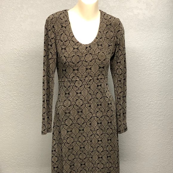 Fab new old stock vintage 90s floral patterned acetate spandex maxi dress with fit and flare styling. It is very classy and classically styled with an empire waist. It is made of the same type of wonderful wrinkle proof fabric that Chico's uses a lot of. This is a size 10 and measures: bust 36, waist 30, hips to 46 due to wide flared skirt., shoulders 16, sleeves 25.5, length 54. This dress is super flattering on and sure to turn heads. New old stock perfect, unworn condition.