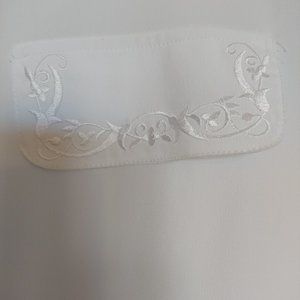 This beautiful white blouse from Kathie Lee is a must-have for any vintage clothing lover. Embellished with white embroidery, which adds a touch of class, it features side slits at the bottom for a stylish touch and ease of movement. The back features a flat pleat down the middle of the back again for ease of movement and to add a stylish touch. The blouse is in new, never worn condition with the original tag still attached, making it a rare find. The size is 24W, and it is suitable for any occasion, whether it's a formal event or a casual day out. Don't miss the chance to add this gorgeous piece to your collection.