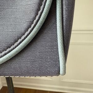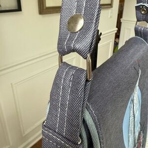 Shoulder bag that is “constructed to last”! This one features a hand painted and embossed sailboat on the front flap with velcro closure. The vinyl is two tone blue and it almost has a denim appearance to it with white stitching. The bag itself measures 11 1/2 inches wide and 4 inches deep at the widest point and 8 inches tall. The strapped drop is approximately 15 inches. The strap is not adjustable, this is a true shoulder bag. It features internal and external slip pockets,