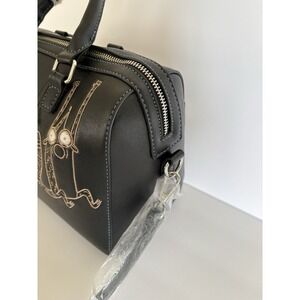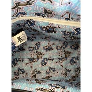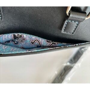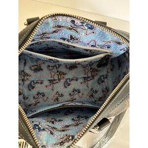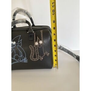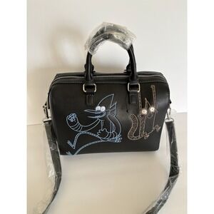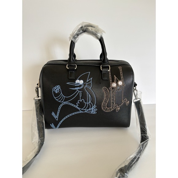 The product is a Medium-sized Rectangle-shaped handbag with a zip closure, featuring embroidered Mordecai and Rigby characters on the exterior. Made from Faux Leather in a black color with silver hardware accents, this black tote bag is perfect for casual occasions. It comes with a detachable shoulder strap for added versatility and can be worn as a shoulder bag or carried with the top handle. The handbag also includes an adjustable shoulder strap and is adorned with a blue lining with a print of the Cartoon Network show, The Regular Show.