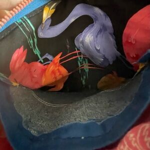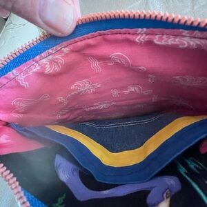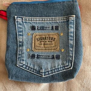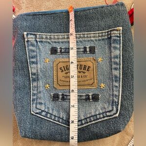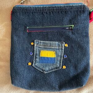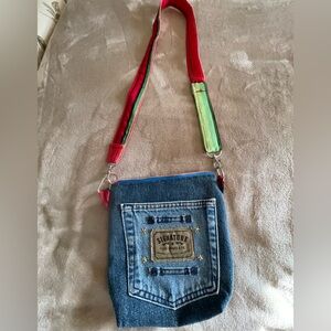 Denim bag with a bold red and green strap. Features Signature Pocket in front and second pocket in back. Zipper close on top with two separate compartments inside. Adorable!