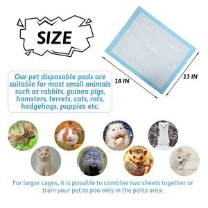 Value Pack: Pack contains 100 small pee pads that will last for approximately 3 months of normal use on small pets such as rabbits and guinea pigs. Great value for money and saves you time on your purchase. Each disposable pet pee pad measures 18 x13 inches (45 x 33 cm) and the innner part measures 16.5 x11.8 inches (42 x 30 cm) and fits most small animal cages, owners please check the size before purchasing