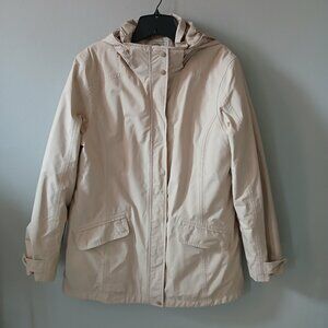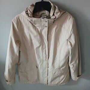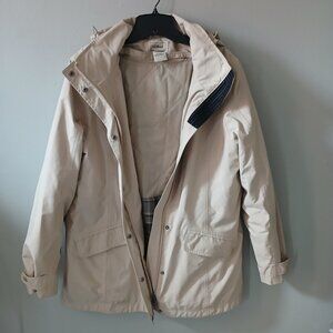 This L.L. Bean Women's Beige Jacket is a stylish and practical outerwear option for the fall and winter seasons. Made of durable polyester with a cozy nylon lining, it features a full zip closure and detachable hood for added versatility. The classic plaid pattern and button accents give it a timeless look, while the spacious pockets provide convenient storage for essentials. Perfect for outdoor activities or everyday wear, this jacket is a must-have for any woman's wardrobe.