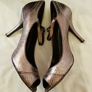 In great condition and comes with original box, "Ciji" distressed metallic pewter genuine leather mary jane heels with bronze contrasting accents, reptile/crocodile embossing and spectator type details. Heel is approximately 4". See last picture for discoloration at the top of the right heel.