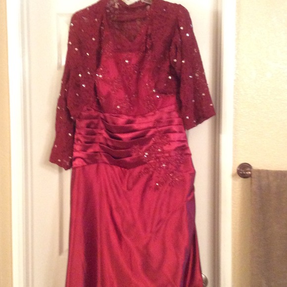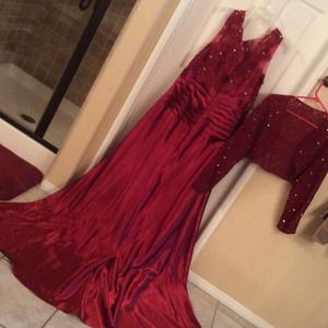 🎄PERFECT FOR PARTY OR WEDDING🎄💞One of a kind gorgeous Burgundy silk 2/piece long formal gown with Bolero jacket to match! I bought it for my sons wedding but ended up wearing a different dress😍it's absolutely stunning on and never been worn before. 🎀NWOT🎀 A few of the sequins in the jacket need to be tightened, that's why I'm selling it so low. It's an easy fix, I just don't sew!😘 it flows like butter💋Jacket is lace💃