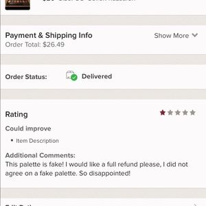 @cagandahan_24 oh wow! You should send poshmark an email. The rating doesn’t prompt them to do anything you have to reach out to them directly. You should say that you did some research and realized that the palette is fake. They should close her closet too for selling fakes!