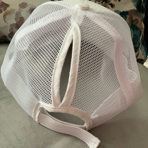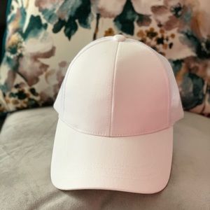 White basic baseball cap with a cut out for high pony. Solid white on the front and white mesh on the back with a white Velcro snap