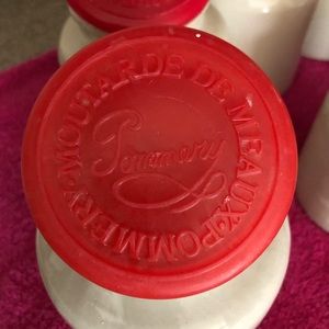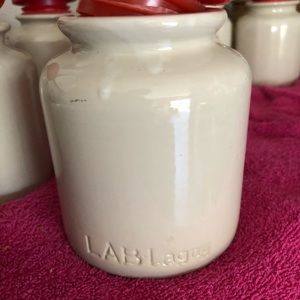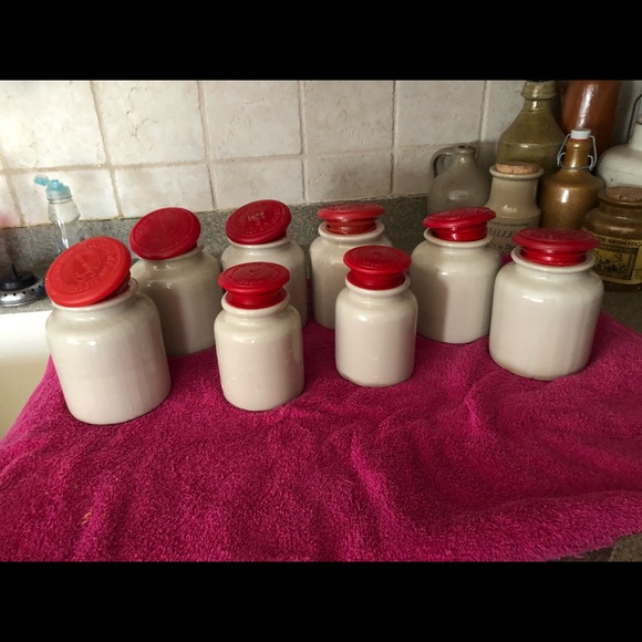 Set of six large and two small LABLangy grey stoneware French mustard crocks, with original red lid. Only one large marked with stamp. All in excellent vintage condition. Great rustic European decor . Price is for all as a set.