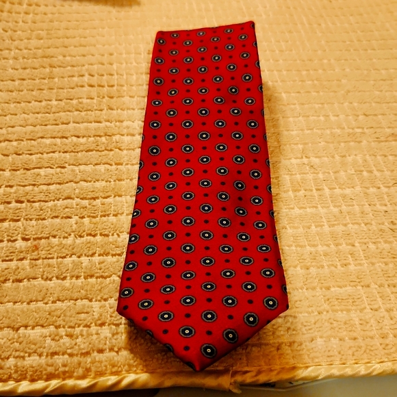 TIE...IMPORTED 100%SILK....EXCELLENT CONDITION...RED/BLUE/GRAY//WHITE DOT...BIN #10
