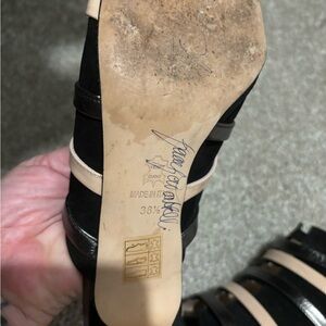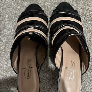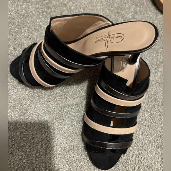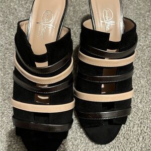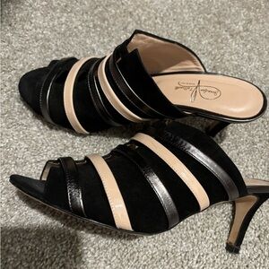 Gorgeous handmade Jennifer Tattanelli kitten heel sandals Black velvet suede with fun metal and beige straps across front.
