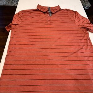 LOT OF 2. BRAND NEW without tags. Men’s Lululemon performance polo shirts. 1 gray, 1- rust with black stripes. Short sleeves, collared, logo, polyester blend, lightweight. Size XL. See photos for measurements