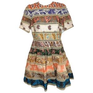Zimmermann 'Devi' Spliced Mini Dress. From the 2023 collection. Short sleeves. Fitted bodice with a full skirt. Linin. Gold lace trims. Zipper closure at the back. In excellent pre-owned condition, no flaws. Length 34", bust 32", waist 28".