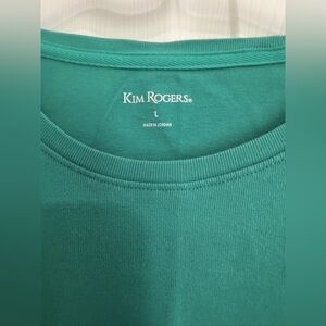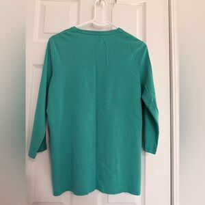 Stylish teal blouse. Features 3/4 sleeves. Perfect for casual wear.