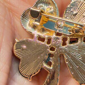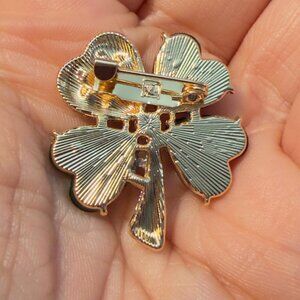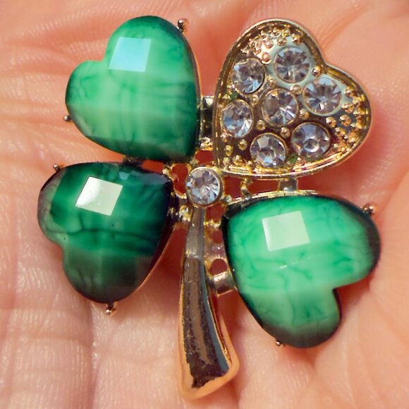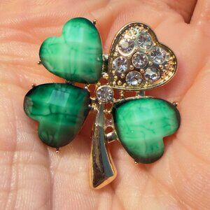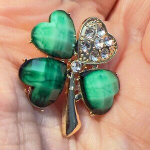 This shamrock brooch features three heart-shaped green stones arranged in a classic shamrock design, accented with clear rhinestones for added sparkle. The faceted, marbled green stones create depth and visual interest, while the gold tone metal adds a warm contrast.