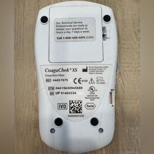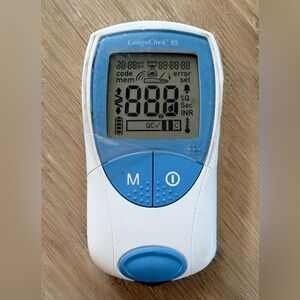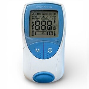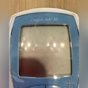 This is a Roche CoaguChek XS system, a portable point-of-care coagulation testing meter used for monitoring warfarin therapy.