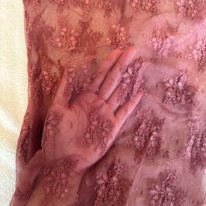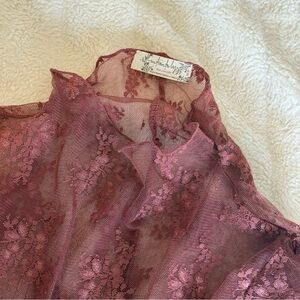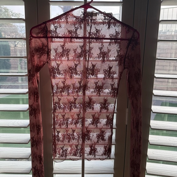 Elegant sheer pink lace top with long sleeves. Perfect for layering or a night out.
