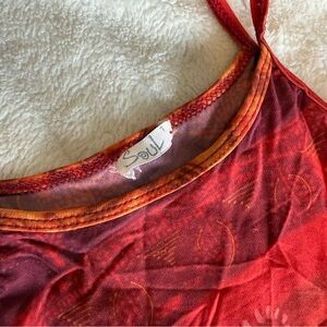 This vibrant women's tank top features a stunning red and orange floral design and is slightly sheer/mesh