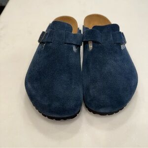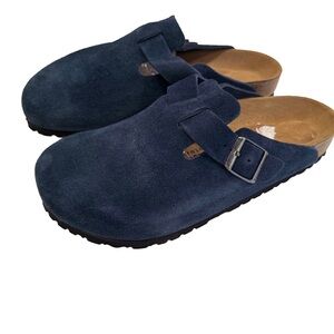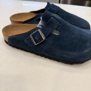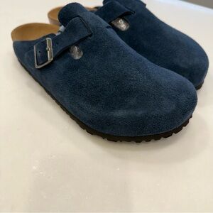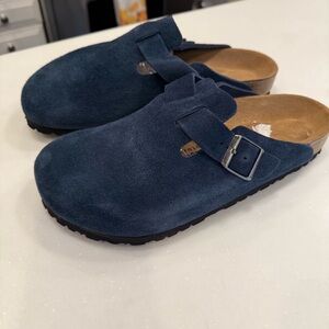 BRAND NEW without box. Men’s Birkenstock Bostons in new navy blue. Soft foot bed, suede uppers & lining, rubber soles, adjustable strap. Men’s size US 10 EU 43. Regular width. MSRP $169