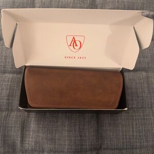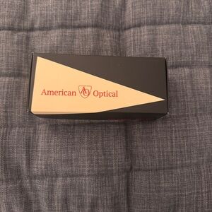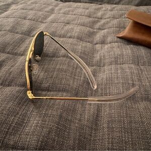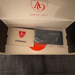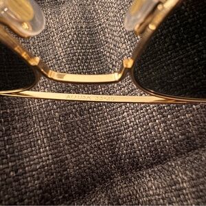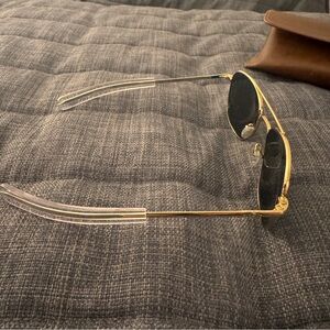 American Optical original pilot sunglasses in gold. 55-20-140mm measurements. Revant grey polarized lenses. Comes with original box, cases, unopened cleaning cloth and pamphlet.