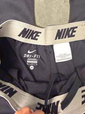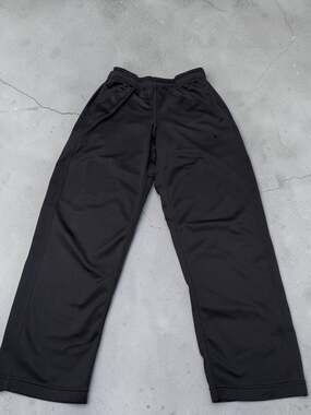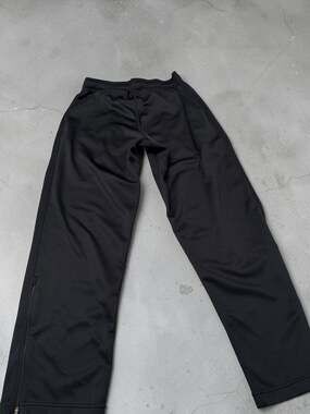 Nike Men's Dri-FIT Training Track Pants in black, size Medium. These performance-ready pants feature a functional elastic waistband and adjustable ankle zips for easy on-and-off over shoes. The moisture-wicking Dri-FIT fabric ensures you stay dry and comfortable during workouts or casual wear. Included are side mesh panels for breathability and hidden side pockets for small valuables. Excellent pre-owned condition with no visible holes, stains, or damage to the fabric or zippers.